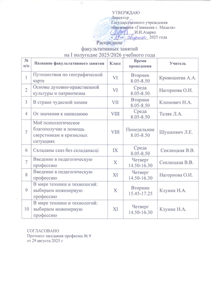 | 1 | Чел. и мир | Инф/Англ.язык | Бел.язык | Химия | Бел.литер | Англ.язык*/Физика* | Астрономия |